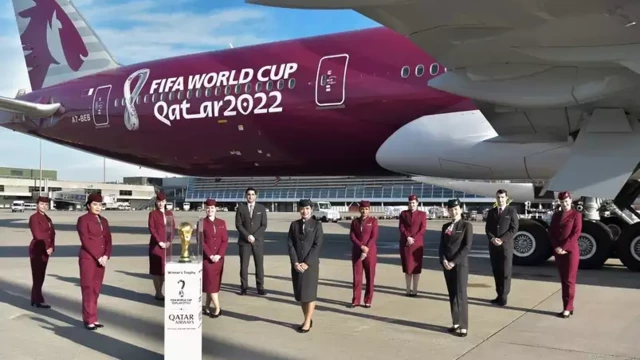 ഖത്തര്: ഖത്തർ എയർവേയ്സ് ഫിഫ ലോകകപ്പ് പെയിന്റ് ചെയ്ത ബോയിംഗ് 777 വിമാനം ഫാൻബറോ ഇന്റർനാഷണൽ എയർ ഷോയിൽ പ്രദർശിപ്പിച്ചു. ലോകത്തിലെ ഏറ്റവും മികച്ച ബിസിനസ് ക്ലാസായ ക്യു-സ്യൂട്ട് ഉൾപ്പെടെയുള്ള അത്യാധുനിക സൗകര്യങ്ങളാണ് ഖത്തർ എയർവേയ്സിന്റെ ബോയിംഗ് 777 വിമാനത്തിലുള്ളത്. ലോകകപ്പ് നിറങ്ങളും ലോഗോയും വിമാനത്തിൽ പെയിന്റ് ചെയ്തിട്ടുണ്ട്. ലോകകപ്പിന്റെ ലോഗോ പൂർണ്ണമായും വിമാനത്തിൽ വരച്ചിട്ടുണ്ട്. 2020 നവംബറിൽ ഫിഫയുമായി ഖത്തർ എയർവേയ്സ് ലോകകപ്പ് പങ്കാളിത്ത കരാറിൽ ഒപ്പുവച്ചതിന്റെ ആഘോഷാർത്ഥമാണ് വിമാനത്തിൽ ലോഗോ കൈകൊണ്ട് വരച്ചതെന്ന് ഖത്തർ എയർവേയ്സ് അറിയിച്ചു.